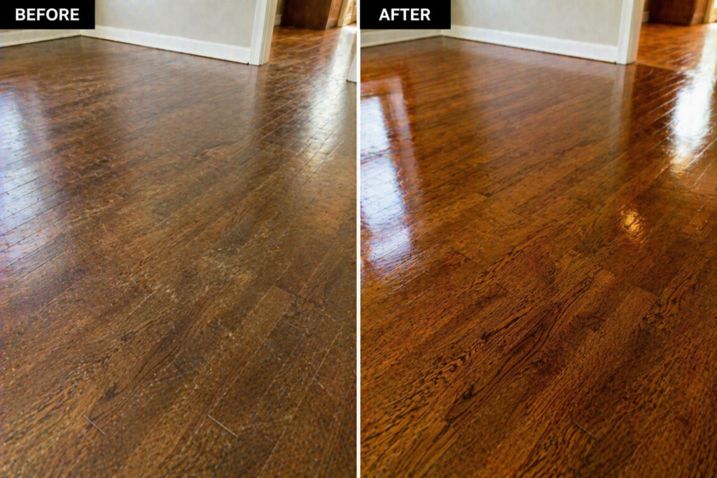 It’s a process that cleans and restores the appearance of wood floors and applies a protective seal—without sanding down the wood.